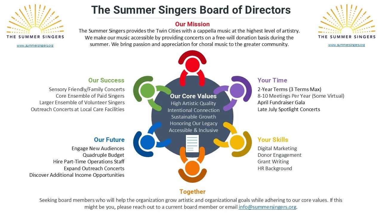 The Summer Singers (TSS) is seeking a part-time Operations Coordinator. This position’s primary responsibilities include coordinating summer rehearsals and concerts as well as assisting with social media accounts and donor management. The Operations Coordinator reports to the TSS Board and attends Board Meetings. Because the choir's performance season is focused in the summer, hours needed will fluctuate with demand but would average 1-3 hours per week. Some evening/weekend hours are expected to attend meetings; while the majority of the work is remote, in-person attendance to some meetings and concerts is required. The position is primarily focused on operational management that may at times include assistance with marketing and donor administration. This role is expected to expand in future years in alignment with future organizational growth.
